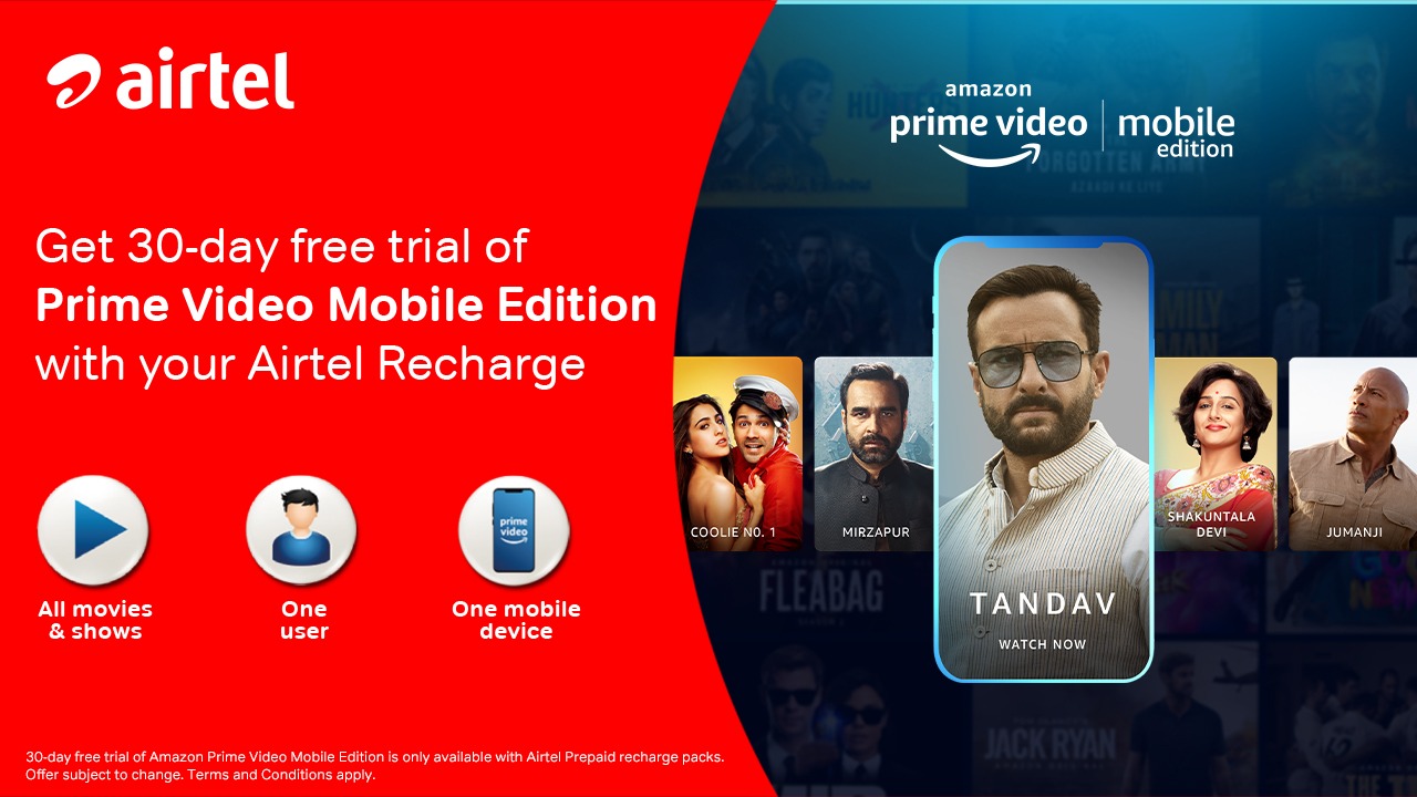 ভাৰতত আৰম্ভ কৰা প্ৰাইম ভিডিঅ’ মোবাইল এডিছনৰ অংশ হিচাপে বাণ্ডল কৰা প্ৰি-পেইড পেকত থকা সকলো Airtel গ্ৰাহকে কেৱল এয়াৰটেলৰ পৰা এমাজনলৈ ছাইন আপ কৰি 30 দিনৰ বিনামূলীয়া ট্ৰায়েল কৰিব পাৰে । 30দিনৰ বিনামূলীয়া ট্ৰায়েলৰ পাচত, এয়াৰটেলৰ গ্ৰাহকসকলে 6GB ডাটাৰ সৈতে 28 দিনৰ প্ৰাইম ভিডিঅ’ ম’বাইল এডিছন প্ৰাপ্ত কৰিবলৈ ₹89-ৰ আৰম্ভণি প্ৰিয় অফাৰেৰে প্ৰাইম ভিডিঅ’ মোবাইল এডিছন উপভোগ কৰিব পাৰে বা 28 দিনৰ বৈধতাৰ ₹299 পেক বাছনি কৰিব পাৰে যাৰ ভিতৰত আছে অসীমিত কল, প্ৰতিদিনে 1.5 GB ডাটা ।